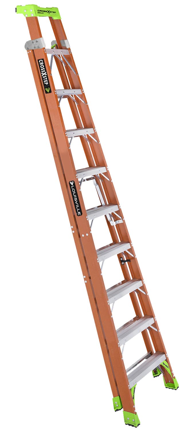 The industry changing Step-to-Extension 2-in-1 Cross Step Ladder is better than ever! Its HiVis green top and shoes makes it easily identifiable to prevent fines and improve workplace safety. SUPERIOR SAFETY: This 10-Foot Cross-Step/Shelf Ladder is made of superior quality, non-conductive fiberglass VERSATILE: Converts from a step ladder into a shelf ladder for a 2 in 1 combination in order to get closer to the work area PATENTED PROTOP™ SYSTEM: V-shape ProTop™ allows the ladder to lean against walls, buildings and poles; and has plenty of features to improve performance when working electrical, construction, and residential jobs. It includes a magnet tray, hardware tray, drill and tool slots, and pipe or 2×4 holder. EQUIPPED WITH SHOX™ SYSTEM: Louisville Ladder exclusive SHOX™ system provides extra durability and resistance to abuse and accidental mishandling. STURDY AND STRONG: With its 300-Pound capacity, elegant design and smooth finish, you won’t find a more durable, reliable ladder. ABOVE AND BEYOND SAFETY STANDARDS: This ladder meets or exceeds the safety standards set by ANSI and OSHA.