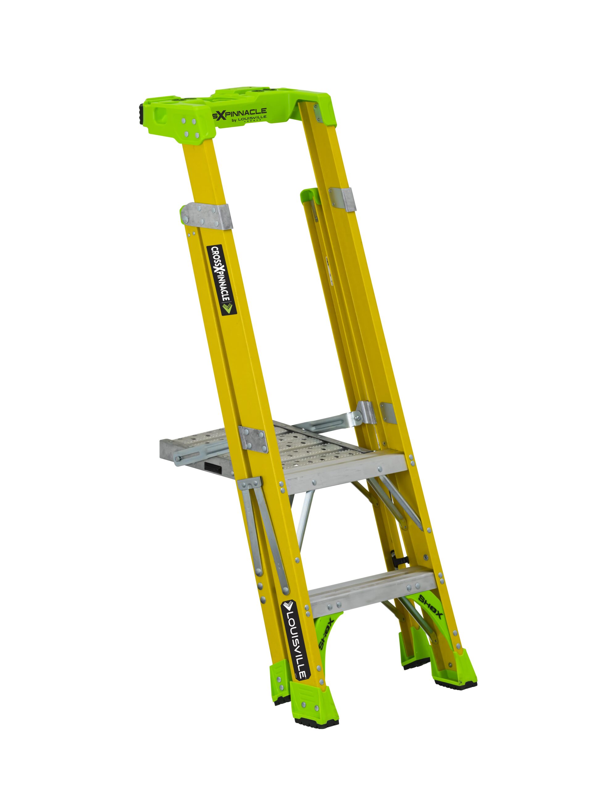 This innovation is the first of its kind. Combining the sturdiness of a platform ladder with the ability to be leaned, this Platform to Leaning 2-in-1 Cross Pinnacle Ladder is a job site must-have. Its HiVis green top and shoes make it easily identifiable to prevent fines and improve workplace safety. This 4-Foot Leaning Platform Ladder is made of superior quality and is non-conductive. The V-shape Pro Top™ allows the ladder to lean against walls, buildings and poles, and onto and into corners, giving it plenty of ways to improve performance when working electrical, construction, and residential jobs. The top includes a magnet tray, hardware tray, drill and tool slots, and pipe or 2×4 holder, and two tool tether anchor attachment points to secure tools with a lanyard. Louisville Ladder’s exclusive SHOX™ system provides extra durability and resistance to abuse and accidental mishandling; it has a 375-Pound capacity, elegant design, and a smooth finish. You won’t find a more durable, reliable ladder. As with all Louisville Ladders, it meets or exceeds the safety standards set by ANSI and OSHA.