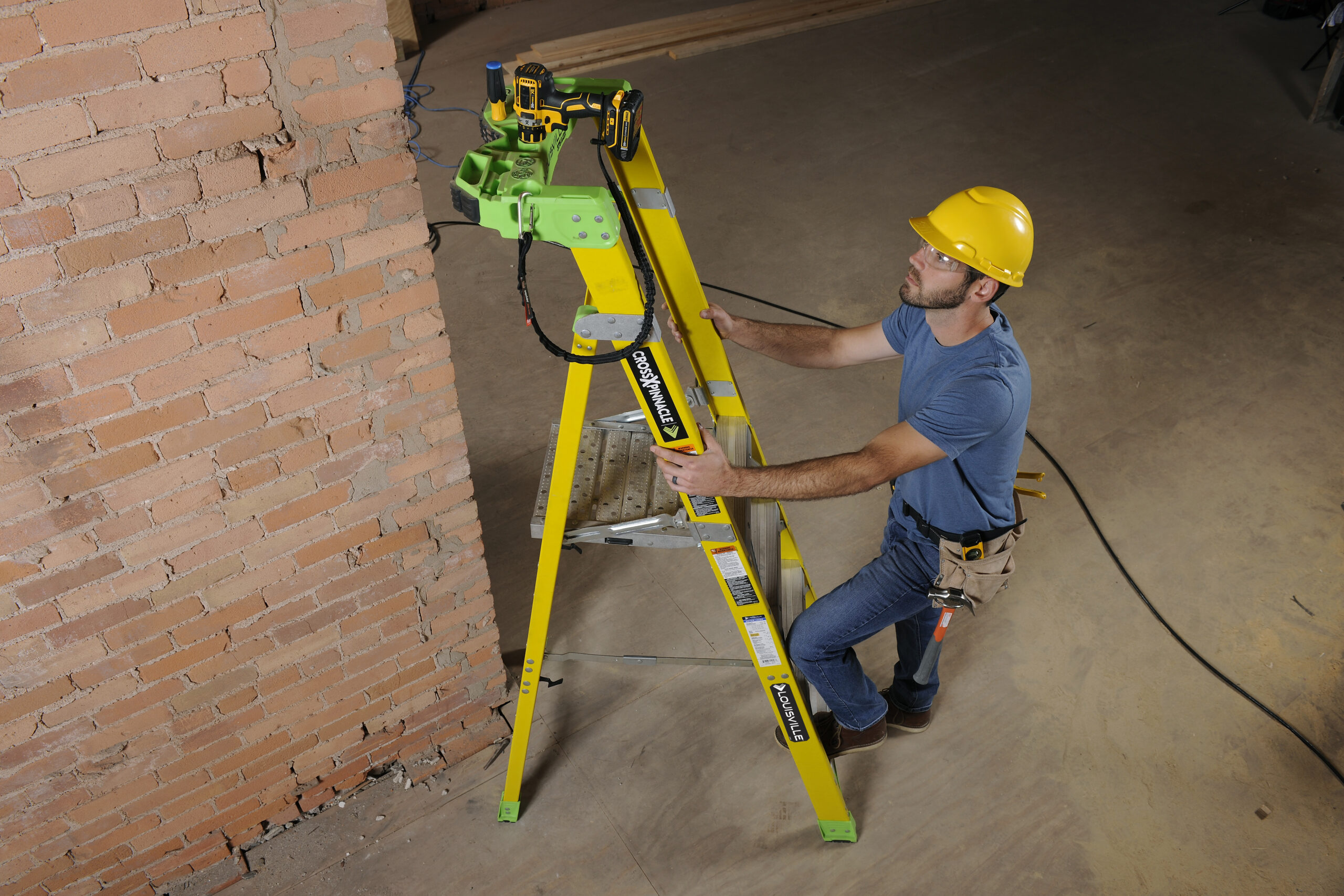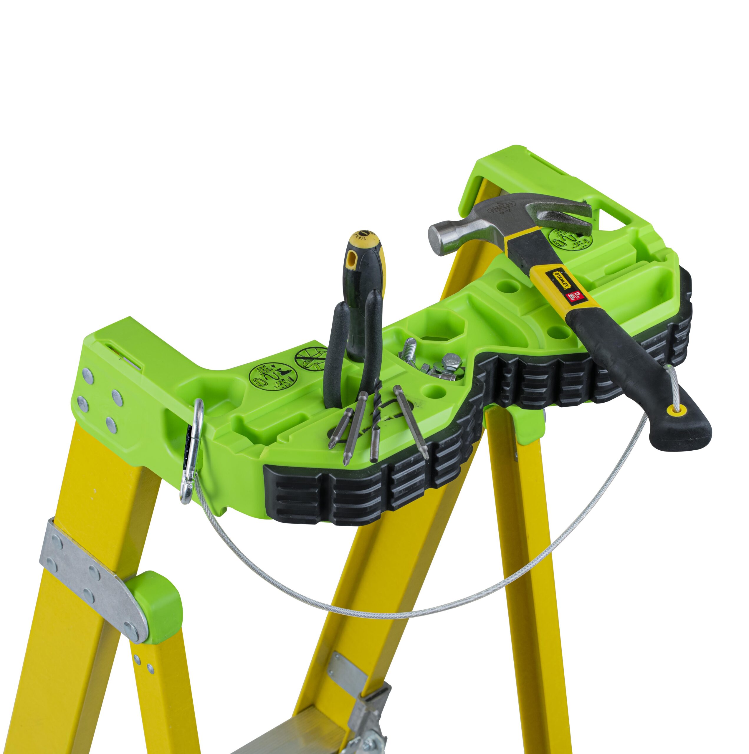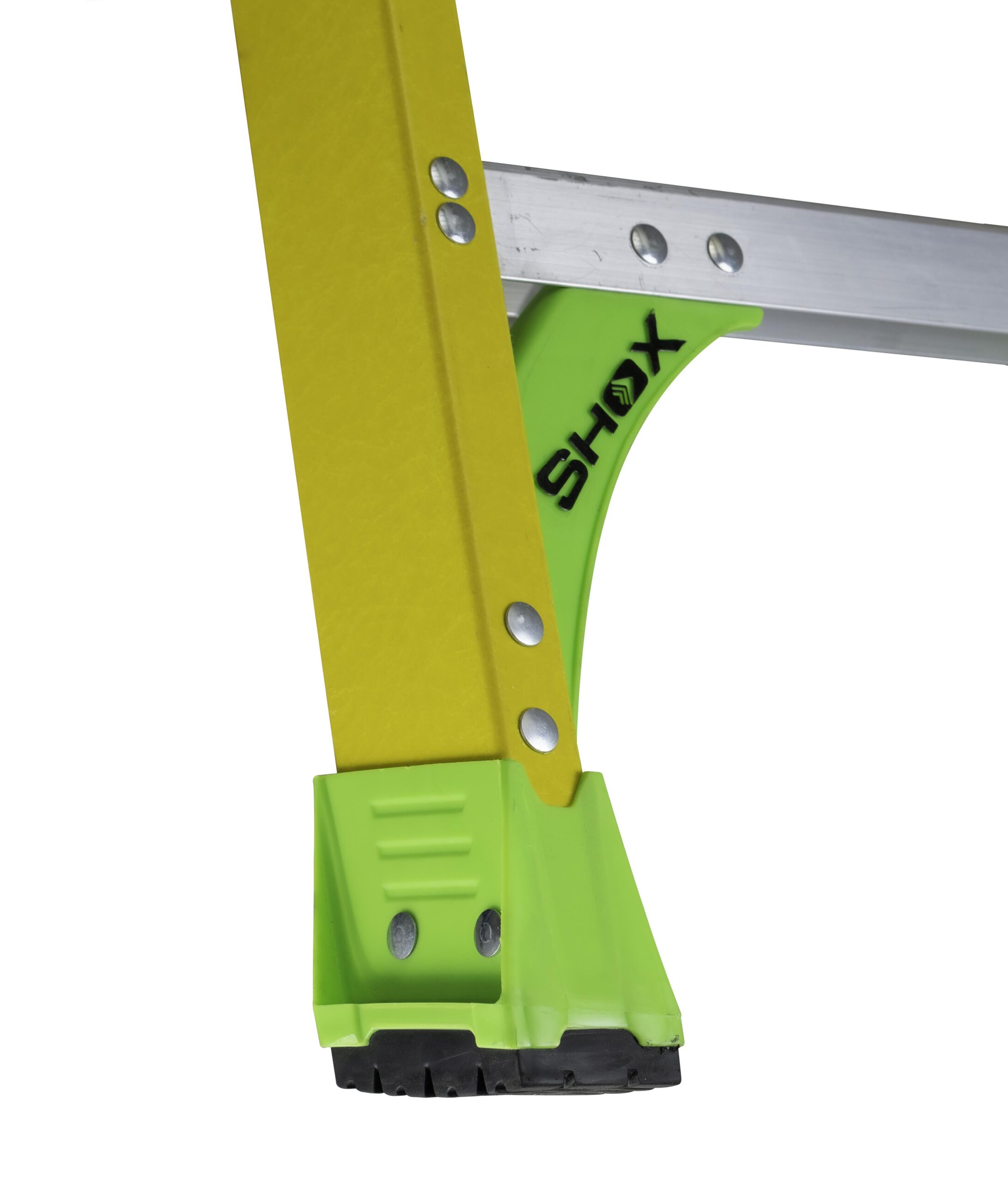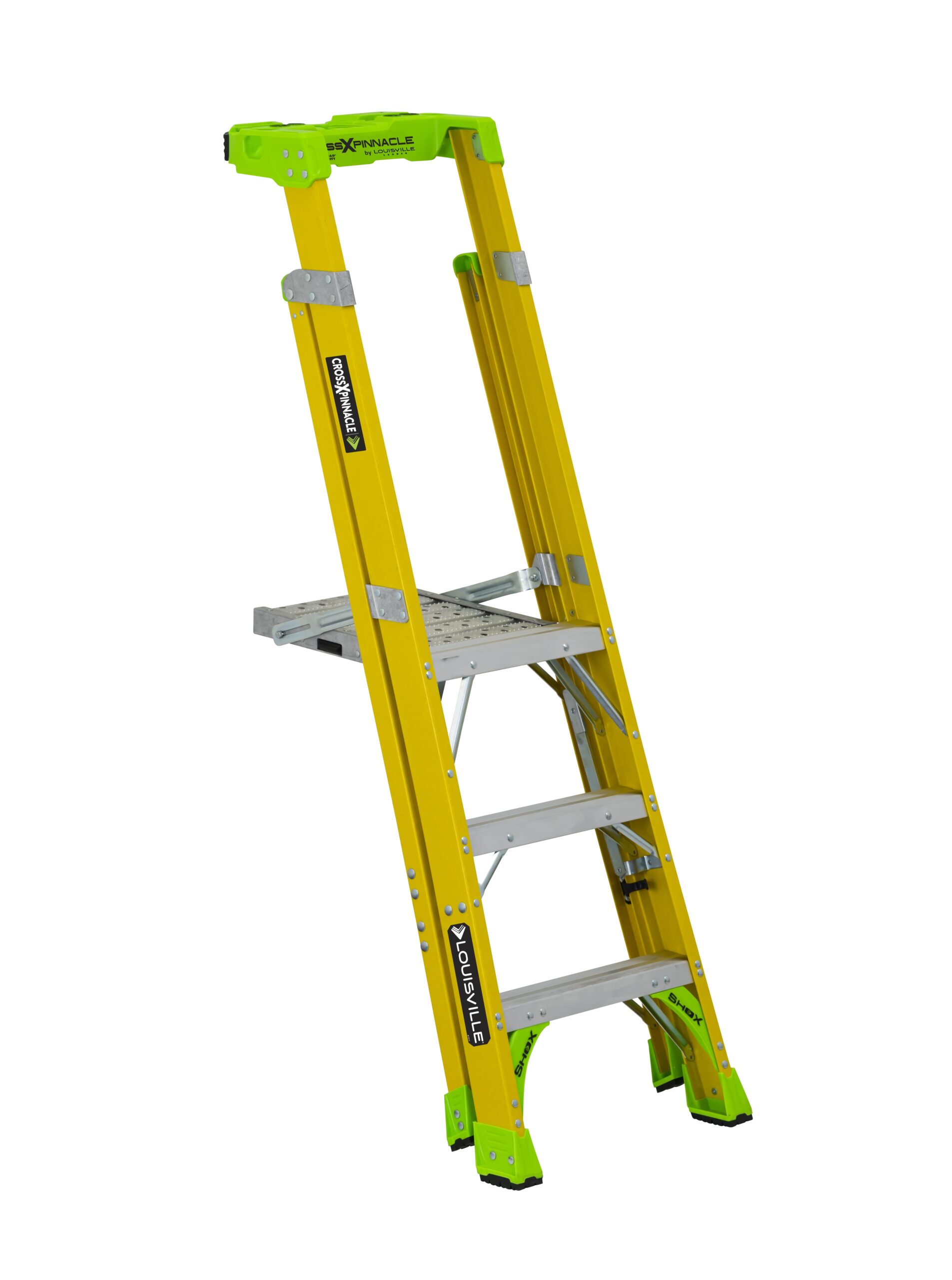 This innovation is the first of its kind. Combining the sturdiness of a platform ladder with the ability to be leaned, this Platform to Leaning 2-in-1 Cross Pinnacle Ladder is a job site must-have. Its HiVis green top and shoes make it easily identifiable to prevent fines and improve workplace safety. This 4-Foot Leaning Platform Ladder is made of superior quality and is non-conductive. The V-shape Pro Top™ allows the ladder to lean against walls, buildings and poles, and onto and into corners, giving it plenty of ways to improve performance when working electrical, construction, and residential jobs. The top includes a magnet tray, hardware tray, drill and tool slots, and pipe or 2×4 holder, and two tool tether anchor attachment points to secure tools with a lanyard. Louisville Ladder’s exclusive SHOX™ system provides extra durability and resistance to abuse and accidental mishandling; it has a 375-Pound capacity, elegant design, and a smooth finish. You won’t find a more durable, reliable ladder. As with all Louisville Ladders, it meets or exceeds the safety standards set by ANSI and OSHA.