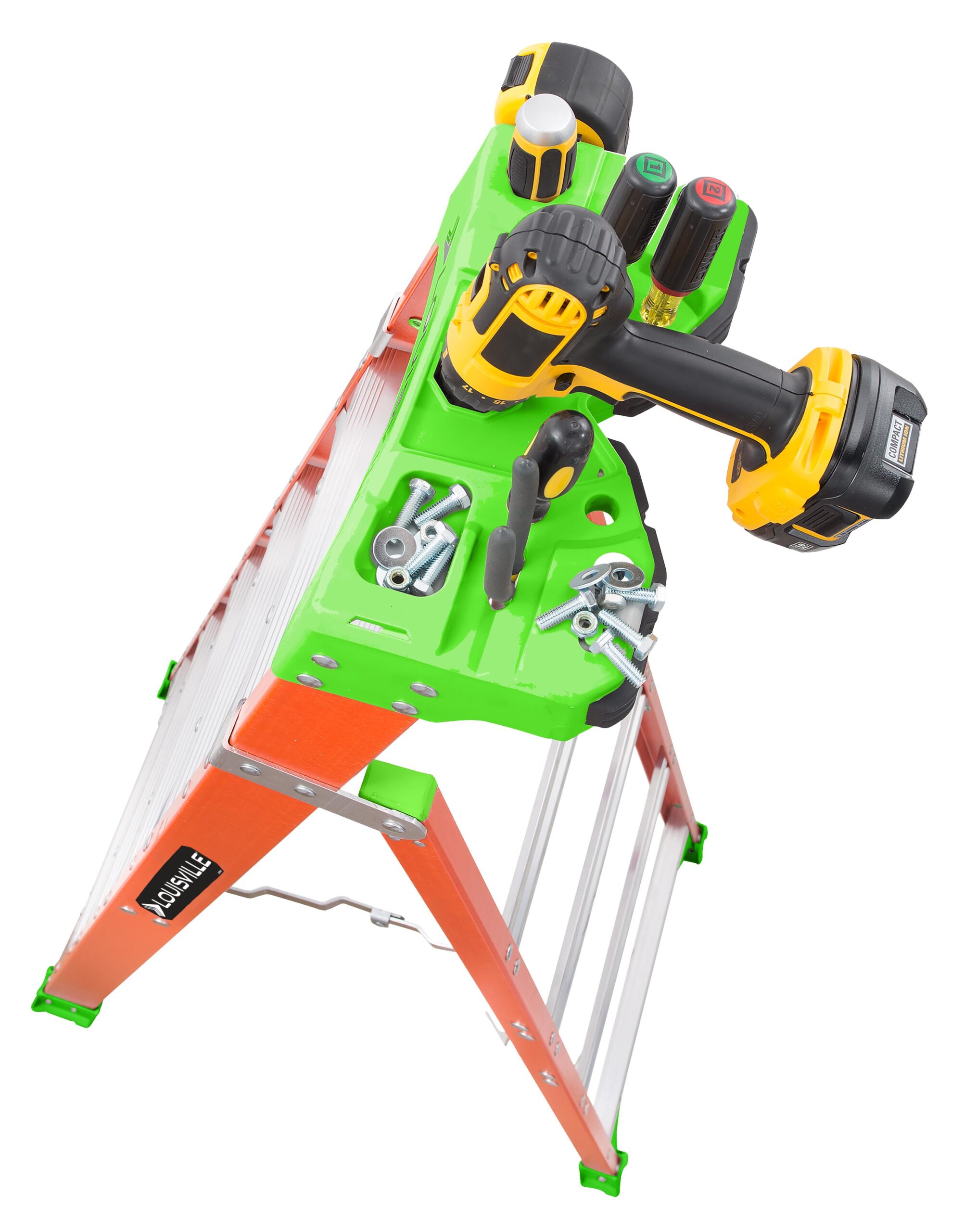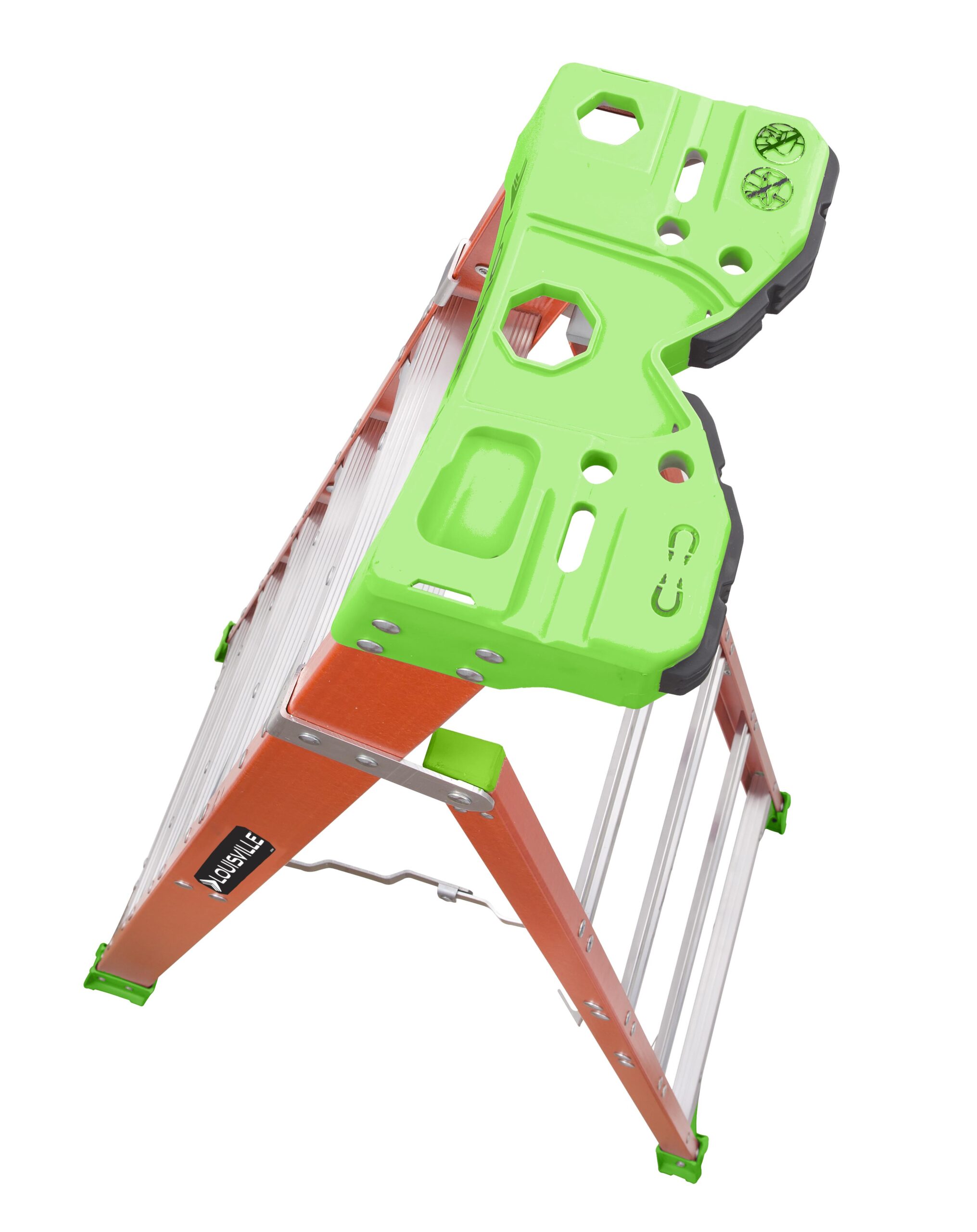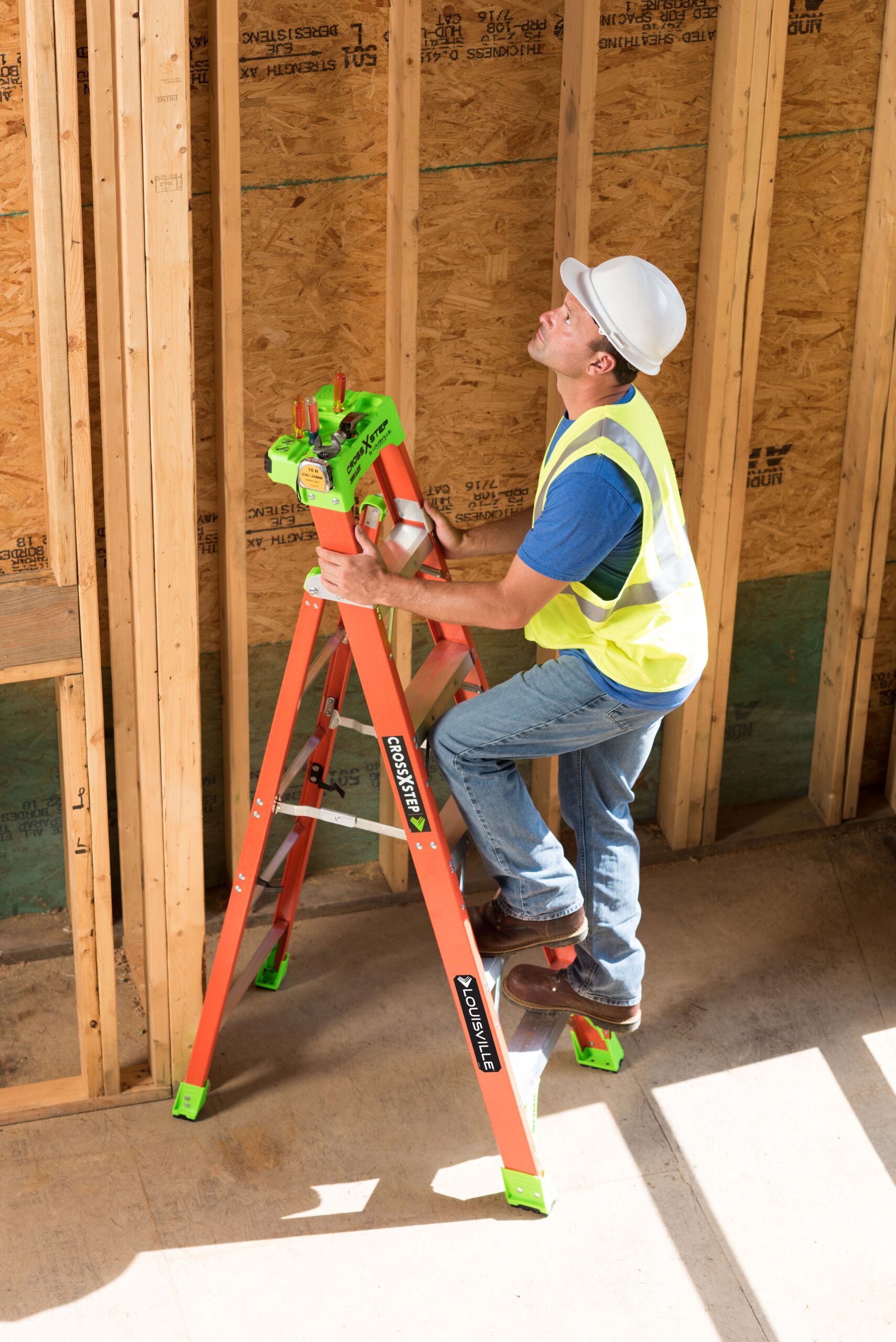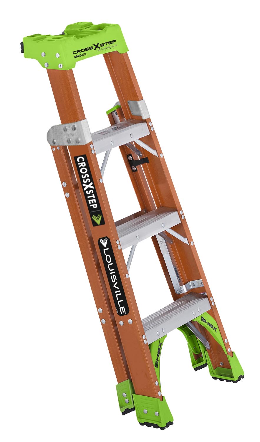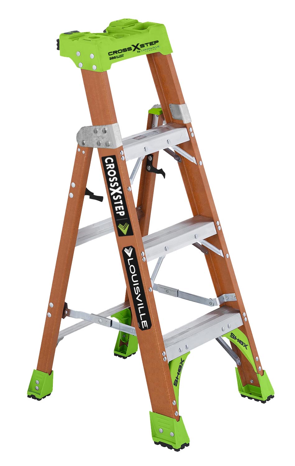 The industry changing Step-to-Extension 2-in-1 Cross Step Ladder is better than ever! Its HiVis green top and shoes makes it easily identifiable to prevent fines and improve workplace safety. SUPERIOR SAFETY: This 4-Foot Cross-Step/Shelf Ladder is made of superior quality, non-conductive fiberglass VERSATILE: Converts from a step ladder into a leaning shelf ladder for a 2 in 1 combination in order to get closer to the work area PATENTED PROTOP™ SYSTEM: V-shape ProTop™ allows the ladder to lean against walls, buildings and poles; and has plenty of features to improve performance when working electrical, construction, and residential jobs. It includes a magnet tray, hardware tray, drill and tool slots, and pipe or 2×4 holder. EQUIPPED WITH SHOX™ SYSTEM: Louisville Ladder exclusive SHOX™ system provides extra durability and resistance to abuse and accidental mishandling. STURDY AND STRONG: With its 300-Pound capacity, elegant design and smooth finish, you won’t find a more durable, reliable ladder. ABOVE AND BEYOND SAFETY STANDARDS: This ladder meets or exceeds the safety standards set by ANSI and OSHA.