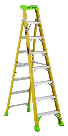 The industry changing Step-to-Extension 2-in-1 Cross Step Ladder is better than ever! Its HiVis green top and shoes makes it easily identifiable to prevent fines and improve workplace safety. SUPERIOR SAFETY: This 8-Foot Cross-Step/Shelf Ladder is made of superior quality, non-conductive fiberglass VERSATILE: Converts from a step ladder into a shelf ladder for a 2 in 1 combination in order to get closer to the work area PATENTED PROTOP™ SYSTEM: V-shape ProTop™ allows the ladder to lean against walls, buildings and poles; and has plenty of features to improve performance when working electrical, construction, and residential jobs. It includes a magnet tray, hardware tray, drill and tool slots, and pipe or 2×4 holder. EQUIPPED WITH SHOX™ SYSTEM: Louisville Ladder exclusive SHOX™ system provides extra durability and resistance to abuse and accidental mishandling. STURDY AND STRONG: With its 375-Pound capacity, elegant design and smooth finish, you won’t find a more durable, reliable ladder. ABOVE AND BEYOND SAFETY STANDARDS: This ladder meets or exceeds the safety standards set by ANSI and OSHA.
