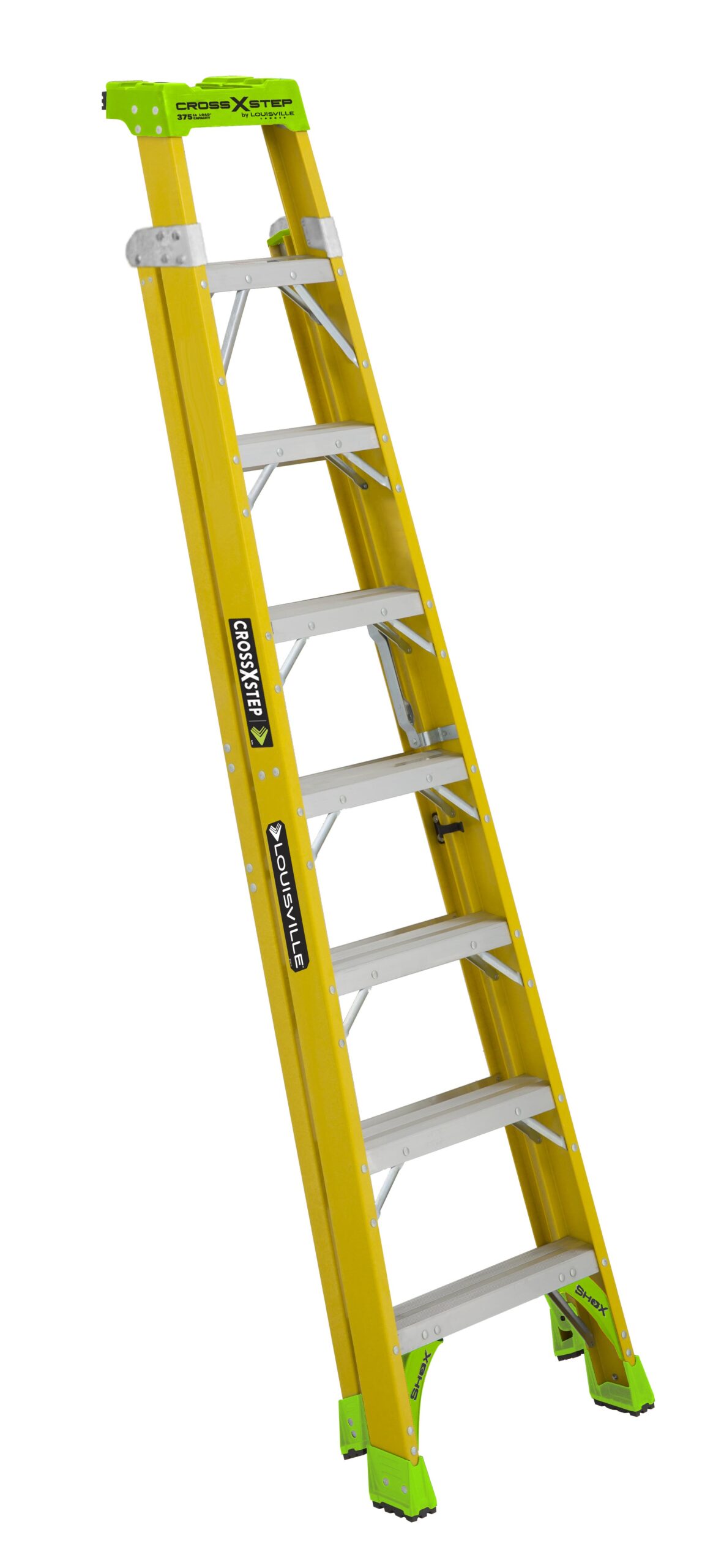 The industry changing Step-to-Extension 2-in-1 Cross Step Ladder is better than ever! Its HiVis green top and shoes makes it easily identifiable to prevent fines and improve workplace safety. SUPERIOR SAFETY: This 8-Foot Cross-Step/Shelf Ladder is made of superior quality, non-conductive fiberglass VERSATILE: Converts from a step ladder into a shelf ladder for a 2 in 1 combination in order to get closer to the work area PATENTED PROTOP™ SYSTEM: V-shape ProTop™ allows the ladder to lean against walls, buildings and poles; and has plenty of features to improve performance when working electrical, construction, and residential jobs. It includes a magnet tray, hardware tray, drill and tool slots, and pipe or 2×4 holder. EQUIPPED WITH SHOX™ SYSTEM: Louisville Ladder exclusive SHOX™ system provides extra durability and resistance to abuse and accidental mishandling. STURDY AND STRONG: With its 375-Pound capacity, elegant design and smooth finish, you won’t find a more durable, reliable ladder. ABOVE AND BEYOND SAFETY STANDARDS: This ladder meets or exceeds the safety standards set by ANSI and OSHA.